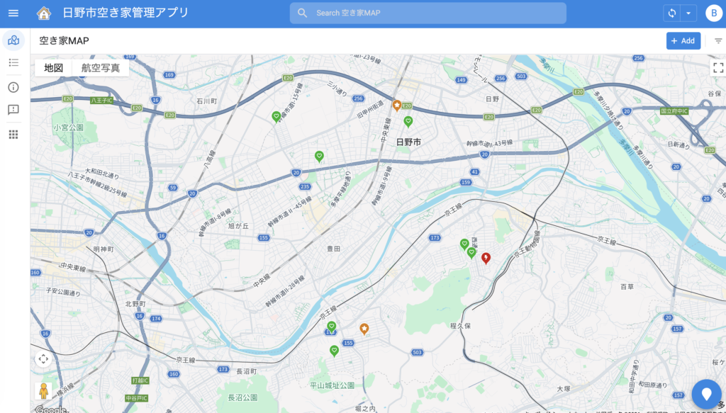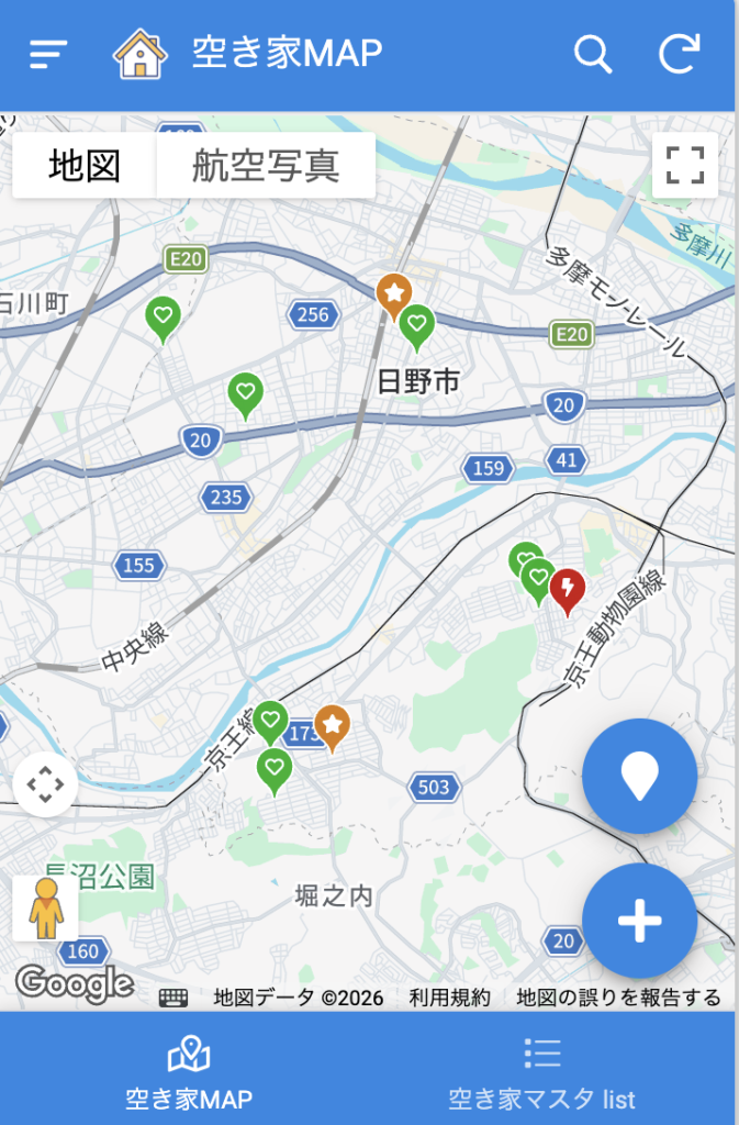 まだサンプルデータを10件くらいしか打ち込んでないのですが、特定空き家に相当する評価のものを🟥、今後放置すると特定空き家化してしまいそうなリスクが考えられる評価のものを🟧、ある程度管理されているものを🟩などで📍を立てることで視覚的に把握ができるようになりました。
