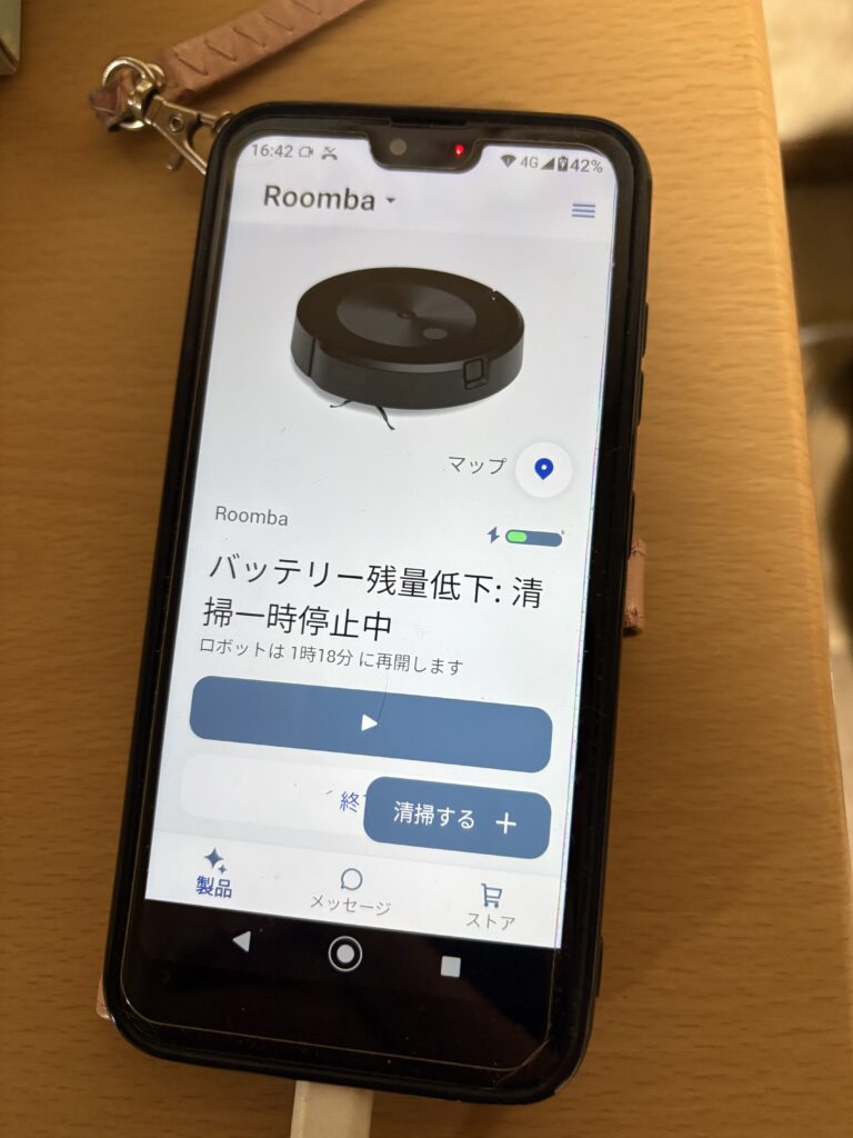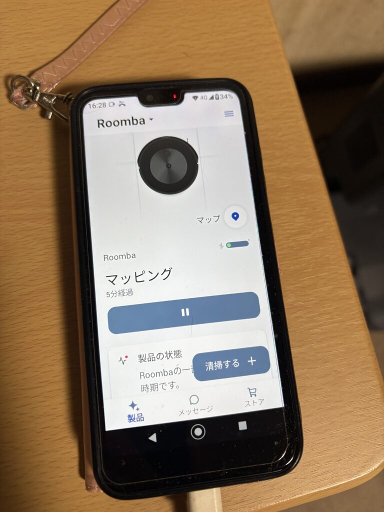 ・・・あれ、お義母さん、充電器のコンセント抜けてますね◎そこでルンバの充電を急いで始めてどうにか接続。マッピングを開始。(マッピングは自宅の中をルンバが一通り通過してお部屋の地図を把握するような行為です)